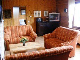 - Aufenthaltsraum mit Couchgarnitur, Essecke und zusätzlicher Schlafcouch